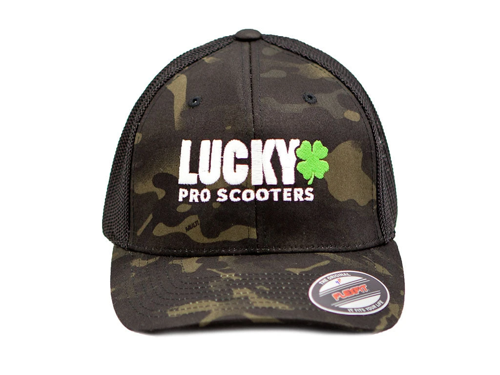 Lucky Solid Logo Curved bill Multi Cam Hat-Â Original Flex Fit OSFA dark camo hat with OG logoÂ